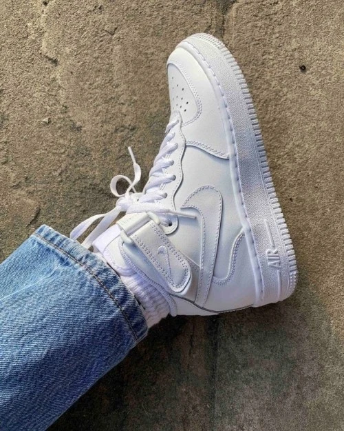 The Nike Air Force 1 Mid in white is a classic, versatile sneaker featuring a crisp, monochromatic design with a mid-cut, padded collar for ankle support. Built with a durable white leather upper, it includes a perforated toe box for breathability, a cushioned foam midsole with encapsulated Nike Air units, and a rubber outsole featuring the signature pivot circles.