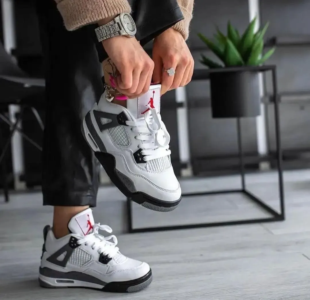 The Nike Air Jordan 4 Retro "White Cement" is an iconic 1989 Tinker Hatfield design, famous for its white leather upper, Tech Grey speckled midsole/wings, and Fire Red accents. The 2025 retro features OG-style "Nike Air" branding on the heel, improved shape, and premium materials, designed to replicate the original.