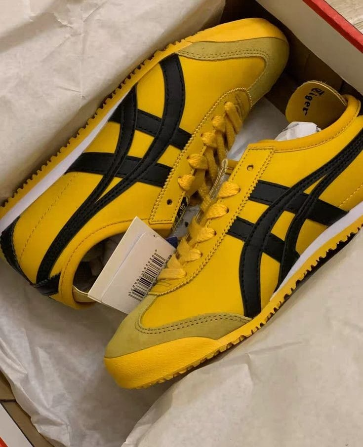 The Onitsuka Tiger Mexico 66 in Yellow/Black is an iconic, unisex low-top sneaker featuring a vibrant yellow leather upper with black tiger stripes, inspired by the 1966 design. It boasts a retro aesthetic with a heel-cross reinforcement, durable rubber sole, and slim silhouette, made famous by Bruce Lee.