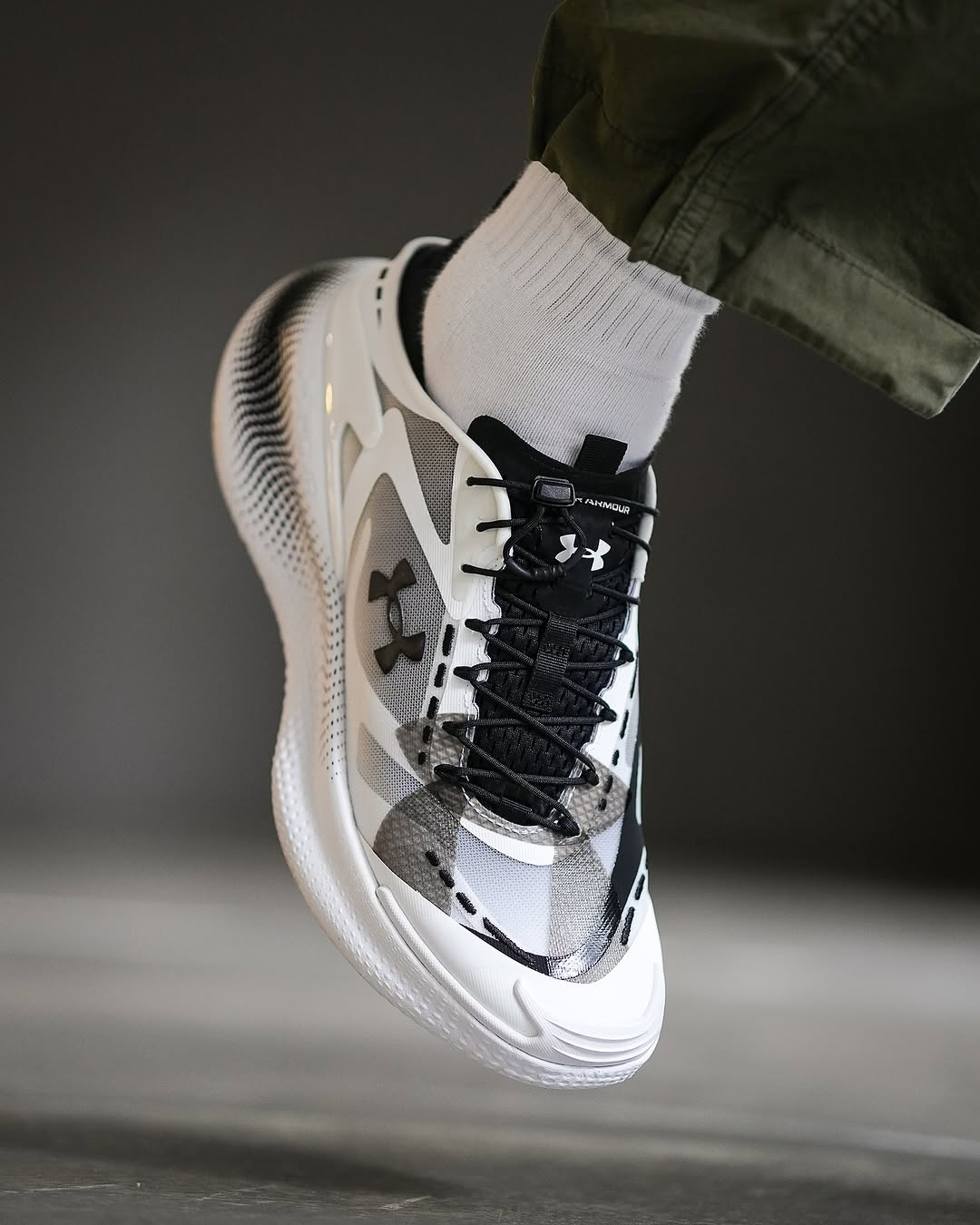 The sneaker in your image is the Under Armour Echo SlipSpeed™ in the "Black/White" colorway. Design: A bold, sculpted silhouette featuring a multi-layer translucent upper made of breathable monofilament mesh. Technology: It utilizes full-length UA HOVR™ cushioning for a smooth ride and high energy return.