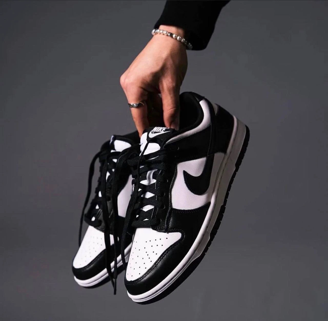 The Nike Dunk Low "Panda" is a highly popular, versatile sneaker featuring a simple two-tone black and white color scheme on a classic 1985 low-top silhouette. Constructed with leather, it includes a white base, black overlays, a black Swoosh, and a white midsole, offering a timeless, minimalist aesthetic suited for everyday wear.