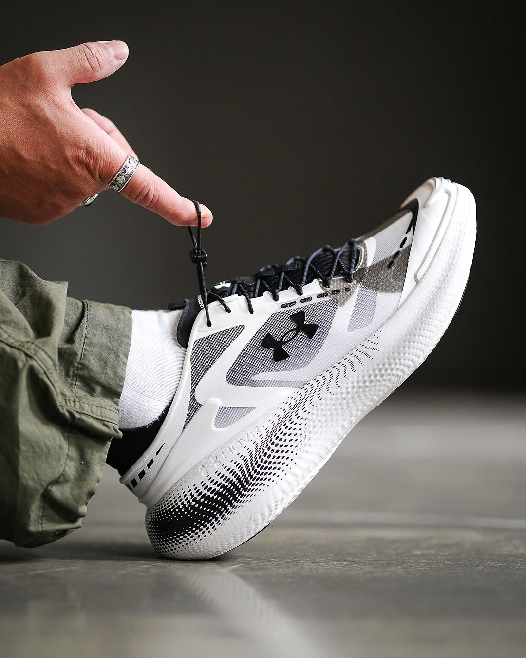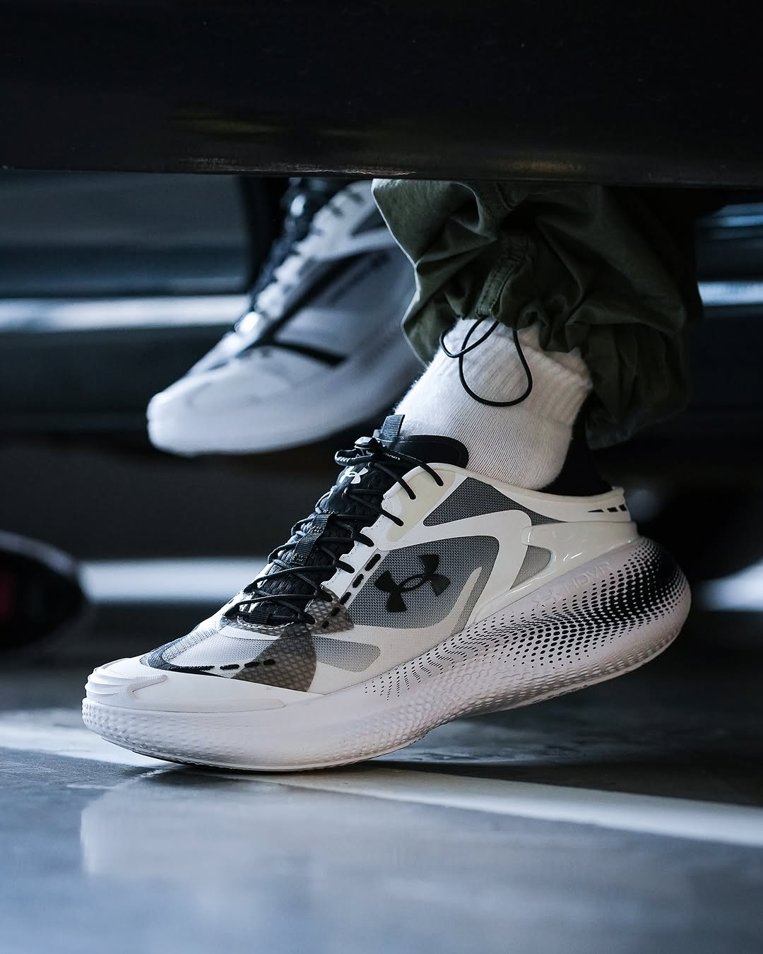 The sneaker in your image is the Under Armour Echo SlipSpeed™ in the "Black/White" colorway. Design: A bold, sculpted silhouette featuring a multi-layer translucent upper made of breathable monofilament mesh. Technology: It utilizes full-length UA HOVR™ cushioning for a smooth ride and high energy return.